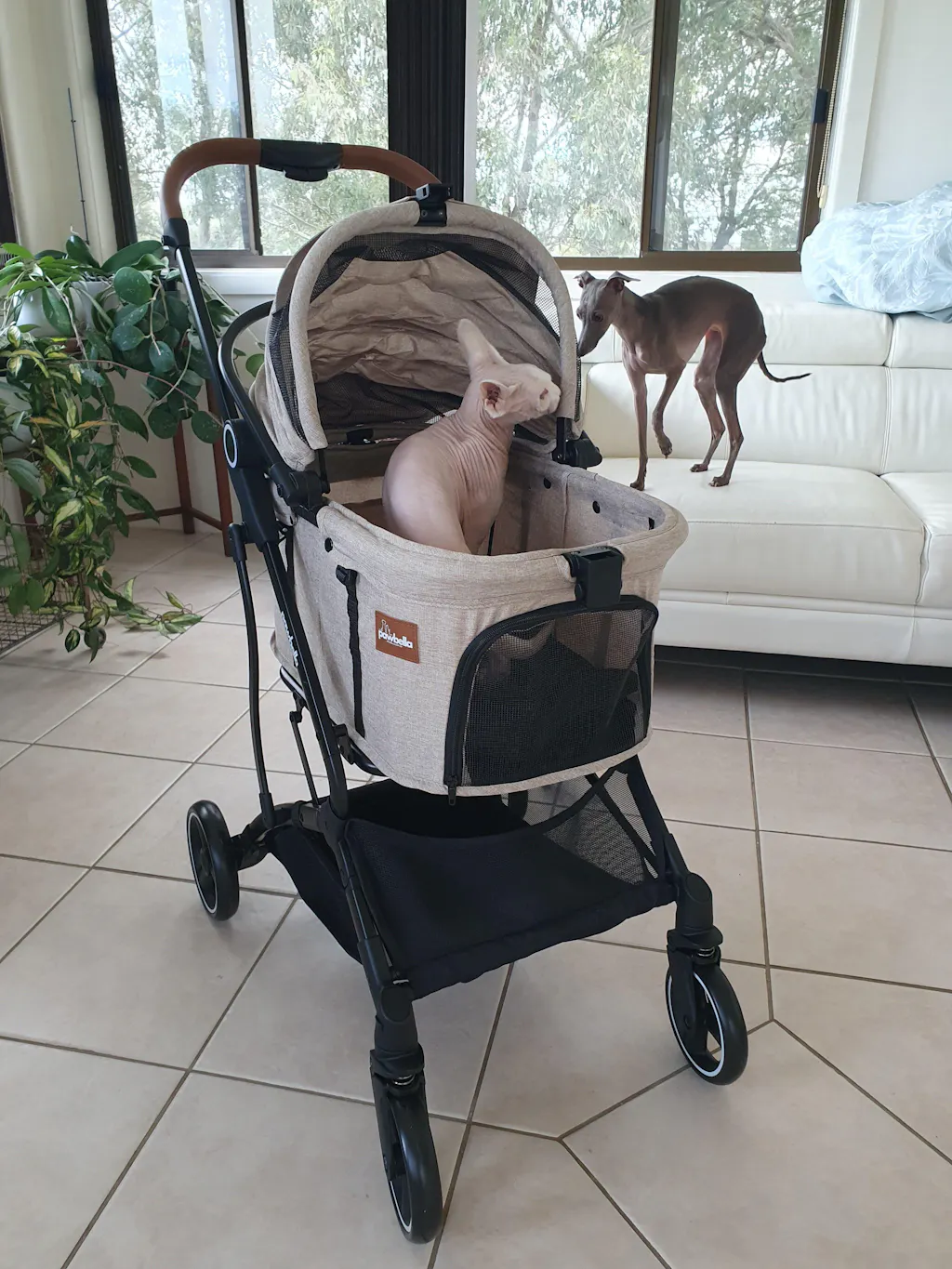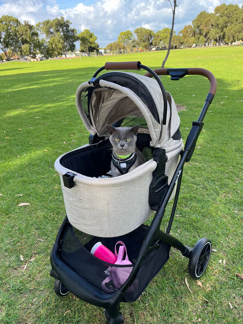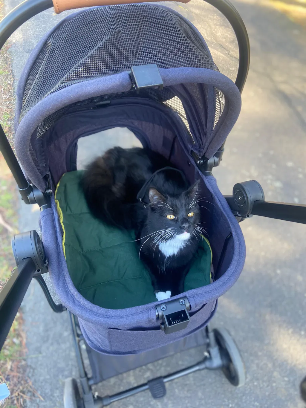 My cat Skeeter LOVES his pet strollers from Pawbella. We have both the Essential and the Ultimate and they're both great quality. We also use cat backpacks but it seems like Skeeter prefers the strollers and we find ourselves using them the most.